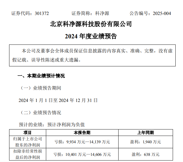 1月20日,科净源发布业绩预告称,公司预计2024年的归母净利润亏损9934万元至1.41亿元,扣非后净利润亏损1.04亿元至1.46亿元。