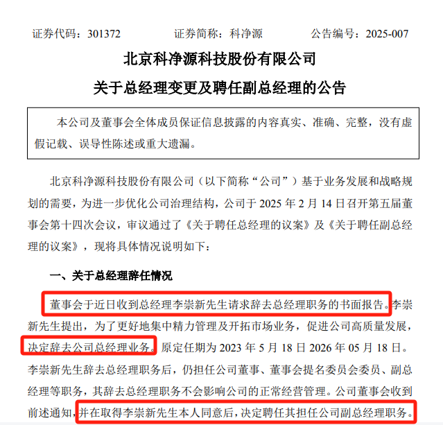 2月14日,科净源公告称,近日,李崇新请求辞去公司总经理职务。